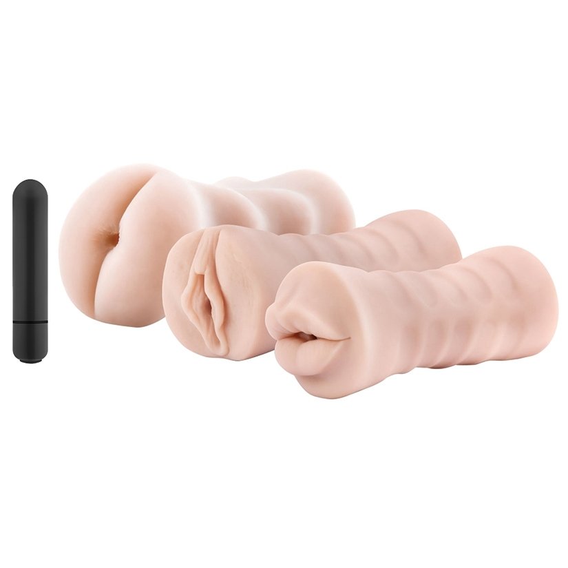 Discover a variety of sensations with the M for Men Soft and Wet Self-Lubricating Vibrating 3-Pack — your all-in-one kit for ultimate solo satisfaction. This value-packed set includes three distinct sleeves designed to simulate the feeling of oral, vaginal, and anal sex. Each stroker is crafted from lifelike X5 TPE material, offering a soft, yielding texture that closely mimics the real thing.